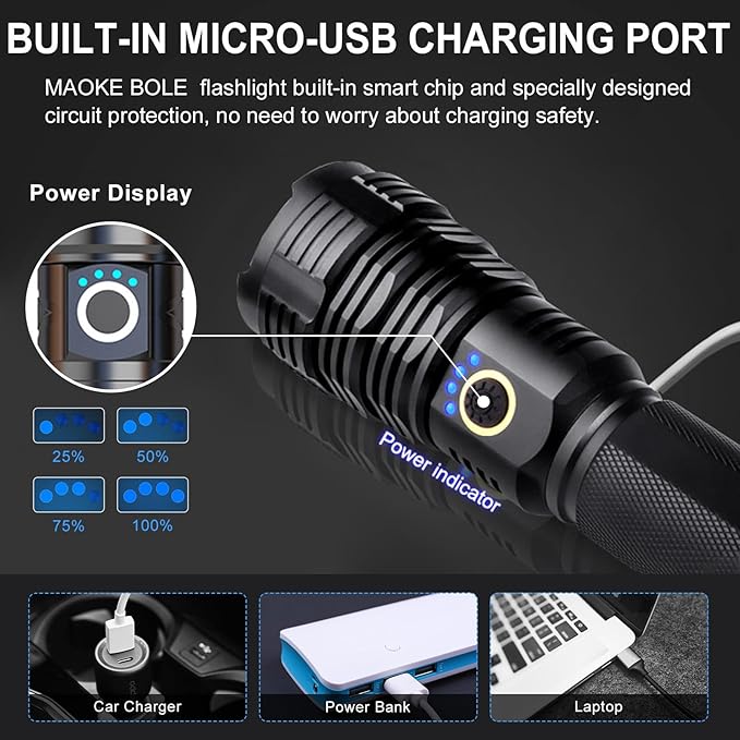 - Versatilidad 🌈: 5 modos de iluminación para adaptarse a todas tus necesidades: alto, medio, ahorro de energía, estroboscópico y SOS.